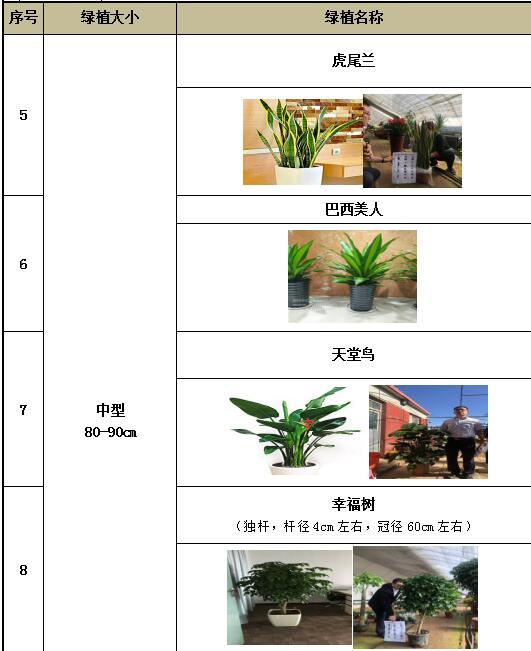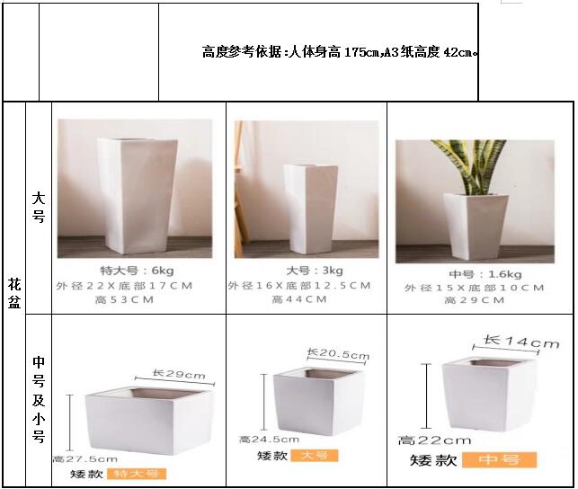 (备注:花盆统一用陶瓷盆,尺寸参考上图,其中大厅服务区用白色花盆,理财区用咖色或黑色花盆,且中型以上含拖轮,小型含水垫。)
