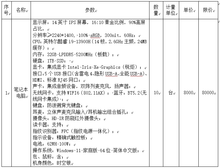 4.采购内容:采购10台笔记本电脑,具体参数及数量详见询价通知书