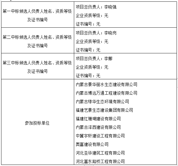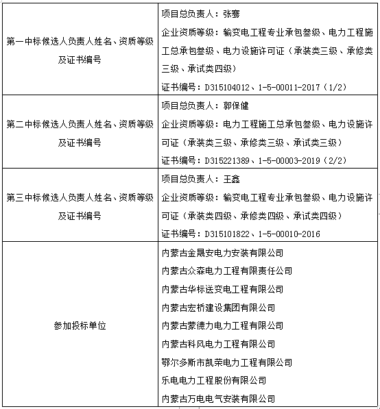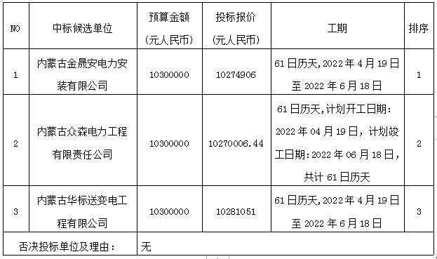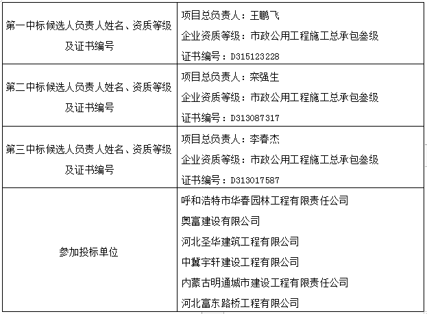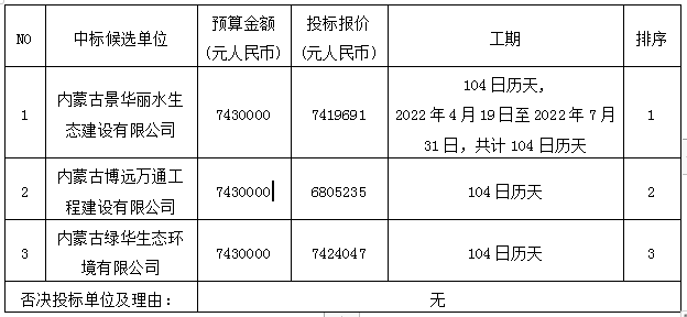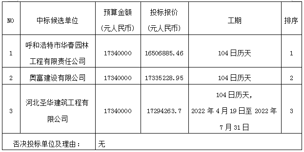 一、项目概况 1.招标项目编号:E1500000701008375003 2.项目实施地点:中国内蒙古自治区呼和浩特市和林格尔县内蒙古和林格尔新区-盛乐现代服务业集聚区-和林格尔新区云谷片区A3西街南侧地块 3.招标项目名称:内蒙古和林格尔新区人才佳苑住宅项目园林绿化硬化、高低压配电专业工程施工 4.集中开标地点:中国内蒙古自治区呼和浩特市新城区兴安北路158号(兴安北路与爱民街交叉口南卫校北楼)网佳会议室 5.审核批准文号:/ 6.项目预算价:最高3507万元人民币 7.公告时间:2022-4-14至2022-4-19 二、标段情况 一标段:内蒙古和林格尔新区人才佳苑住宅项目园林绿化专业工程施工 公示内容 二标段:内蒙古和林格尔新区人才佳苑住宅项目园林硬化景观专业工程施工 公示内容 三标段:内蒙古和林格尔新区人才佳苑住宅项目高低压配电专业工程施工 公示内容 三、提出异议渠道和方式: 如投标人或者其他利害关系人对评标结果有异议,请在公示期间向招标人提出。 四、发布媒体: 内蒙古招标投标公共服务平台(http://www.nmgztb.com.cn) 中国招标投标公共服务平台(http://www.cebpubservice.com) 内蒙古电子招标投标交易平台(http://nmgxh.86ztb.com) 欧宝ob官方网站(http://www.runningriverkennels.com)