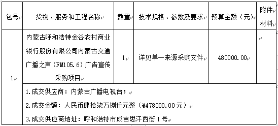 1.采购项目名称:内蒙古呼和浩特金谷农村商业银行股份有限公司内蒙古交通广播之声(FM105.6)广告宣传采购项目