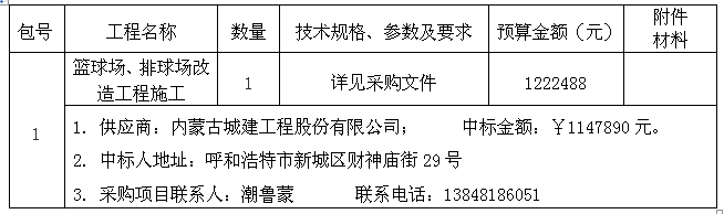 在内蒙古自治区政府采购网(http://www.nmgp.gov.cn/)、内蒙古招标投标网(http://www.nmgztb.com.cn/)、中国采购与招标网(http://www.chinabidding.com.cn/)和欧宝ob官方网站网(http://www.runningriverkennels.com)上同时发布招标公告。于2017年7月24日就内蒙古自治区团校篮球场、排球场改造工程施工项目(UPSG-170622)采用公开招标方式进行招标。现就本次采购的中标结果公告如下。