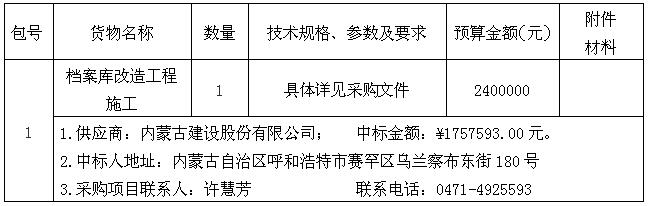 欧宝ob官方网站受内蒙古自治区住房资金管理中心的委托,于2017年9月22日同时在内蒙古自治区政府采购网(http://www.nmgp.gov.cn/)、内蒙古招标投标网(http://www.nmgztb.com.cn/)、中国采购与招标网(http://www.chinabidding.com.cn/)、欧宝ob官方网站网(http://www.runningriverkennels.com)上发布招标公告。于2017年10月19日就档案库改造工程施工(UPSG-170911)采用公开招标进行采购。现就本次采购的中标结果公告如下。