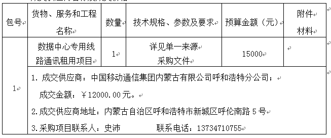 欧宝ob官方网站受内蒙古自治区福利彩票发行管理中心委托,于2018年10月15日在内蒙古自治区政府采购网(http://www.nmgp.gov.cn/)、中国招标投标公共服务平台(http://www.cebpubservice.com/)、内蒙古招标投标公共服务平台(http://www.nmgztb.com.cn)及欧宝ob官方网站网(http://www.runningriverkennels.com)发布单一来源采购公告。于2018年10月19日就内蒙古自治区福利彩票发行管理中心数据中心专用线路通讯租用项目(UPZCFW-181003)采用单一来源采购方式进行采购。现就本次采购的成交结果公告如下。