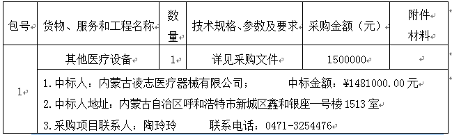 欧宝ob官方网站受呼和浩特市妇幼保健院的委托,于2018年10月08日在内蒙古自治区政府采购网(http://www.nmgp.gov.cn)、呼和浩特市政府采购网(http://www.hhgp.gov.cn)、内蒙古招标投标公共服务平台(http://www.nmgztb.com.cn)、中国招标投标公共服务平台(http://www.cebpubservice.com)、欧宝ob官方网站网(http://www.runningriverkennels.com)上发布招标公告。于2018年10月29日就呼和浩特市妇幼保健院进口医疗设备(外科腹腔器械、妇科氩气刀工作站系统)采购(UPZCCG-180911)采用公开方式进行招标。现就本次采购的中标结果公告如下。