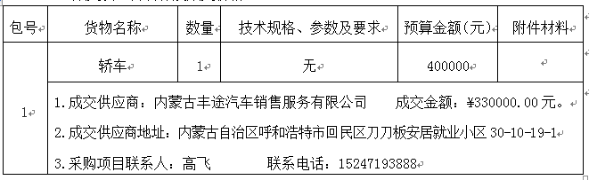 欧宝ob官方网站受中共土默特左旗纪律检查委员会的委托,于2018年10月15日在内蒙古自治区政府采购网(http://www.nmgp.gov.cn)、呼和浩特市政府采购网(http://www.hhgp.gov.cn)、呼和浩特市土默特左旗政府采购网(http://111.235.156.218:7010)、中国招标投标公共服务平台(http://www.cebpubservice.com/)、内蒙古招标投标公共服务平台(http://www.nmgztb.com.cn)、欧宝ob官方网站网(http://www.runningriverkennels.com)上同时发布竞争性谈判预审公告。于2018年10月30日就中共土默特左旗纪检委监委留置场所管理中心车辆购置(UPZCCG-180808)采用竞争性谈判进行采购。现就本次采购的成交结果公告如下。