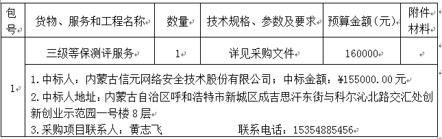 欧宝ob官方网站受内蒙古自治区福利彩票发行管理中心的委托,于2018年10月19日在内蒙古自治区政府采购网(http://www.nmgp.gov.cn)、中国招标投标公共服务平台(http://www.cebpubservice.com/)、内蒙古招标投标公共服务平台(http://www.nmgztb.com.cn)和欧宝ob官方网站网(http://www.runningriverkennels.com)上发布招标公告。于2018年11月8日就内蒙古自治区福利彩票发行管理中心三级等保测评服务(UPZCFW-181005)采用公开招标方式进行采购。现就本次采购的中标结果公告如下: