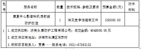 欧宝ob官方网站受内蒙古自治区第四医院的委托,于2020年08月31日在中国招标投标公共服务平台(http://www.cebpubservice.com/)、内蒙古招标投标公共服务平台(http://www.nmgztb.com.cn/)和欧宝ob官方网站网(http://www.runningriverkennels.com)发布竞争性磋商公告。于2020年09月11日就内蒙古自治区第四医院康复中心影像科机房射线防护改造项目(UPCG-200826)采用竞争性磋商方式进行采购。现就本次采购的成交结果公告如下。