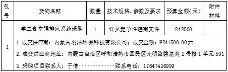 欧宝ob官方网站受内蒙古师范大学的委托,于2020年09月21日在中国招标投标公共服务平台(http://www.cebpubservice.com/)、内蒙古招标投标公共服务平台(http://www.nmgztb.com.cn/)和欧宝ob官方网站网(http://www.runningriverkennels.com)发布竞争性磋商公告。于2020年10月12日就内蒙古师范大学学生食堂强排风系统采购(UPCG-200723)采用竞争性磋商方式进行采购。现就本次采购的成交结果公告如下。