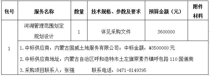 欧宝ob官方网站受土默特左旗水务局的委托,于2019年12月13日在内蒙古自治区政府采购网(http://www.nmgp.gov.cn/)、呼和浩特市政府采购网(http://www.hhgp.gov.cn/)、呼和浩特市土默特左旗政府采购网(http://111.235.156.218:7010)、中国招标投标公共服务平台(http://www.cebpubservice.com/)、内蒙古招标投标公共服务平台(http://www.nmgztb.com.cn/)、欧宝ob官方网站网(http://www.runningriverkennels.com)上发布招标公告。于2020年01月02日就土默特左旗河长制河湖管理范围划定规划设计项目(采购文件编号:UPZCFW-191121)采用公开招标方式进行招标。现就本次采购的中标结果公告如下: