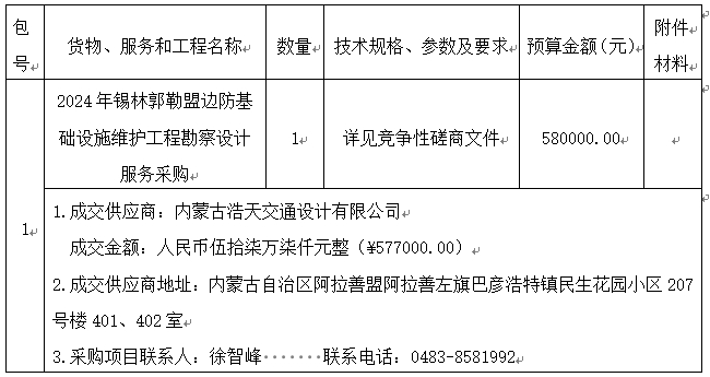 欧宝ob官方网站受锡林郭勒盟边防委员会办公室的委托,于2024年05月06日在中国招标投标公共服务平台(http://www.cebpubservice.com/)、内蒙古招标投标公共服务平台(http://www.nmgztb.com.cn/)和欧宝ob官方网站网(http://www.runningriverkennels.com)上发布竞争性磋商公告。于2024年05月21日就2024年锡林郭勒盟边防基础设施维护工程勘察设计服务采购(竞争性磋商文件编号:UPZBFW-240501)采用竞争性磋商方式进行采购。现就本次采购的成交结果公告如下: