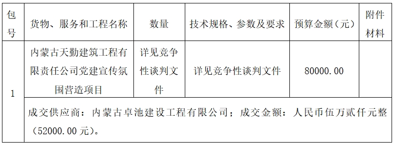 欧宝ob官方网站受内蒙古天勤建筑工程有限责任公司的委托,于2024年12月2日在欧宝ob官方网站网(http://www.runningriverkennels.com)上发布竞争性谈判公告。于2024年12月6日就内蒙古天勤建筑工程有限责任公司党建宣传氛围营造项目(竞争性谈判文件编号:UPZBCG-241134)采用竞争性谈判方式进行采购。现就本次采购的成交结果公告如下。