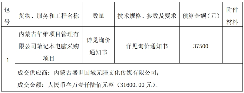 欧宝ob官方网站受内蒙古华维项目管理有限公司的委托,于2024年12月2日在欧宝ob官方网站网(http://www.runningriverkennels.com)上发布询价公告。于2023年12月6日就内蒙古华维项目管理有限公司笔记本电脑采购项目(询价通知书编号:UPZBCG-241204)采用询价方式进行采购。现就本次采购的成交结果公告如下。