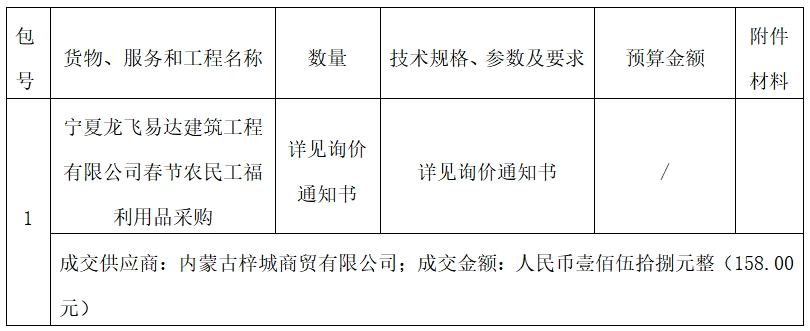 欧宝ob官方网站受宁夏龙飞易达建筑工程有限公司的委托,于2024年12月2日在欧宝ob官方网站网(http://www.runningriverkennels.com)上发布询价公告。于2024年12月6日就宁夏龙飞易达建筑工程有限公司春节农民工福利用品采购(询价通知书编号:UPZBCG-241209)采用询价方式进行采购。现就本次采购的成交结果公告如下。