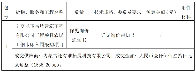 一、采购项目名称:宁夏龙飞易达建筑工程有限公司工程项目农民工钢木床入围采购项目