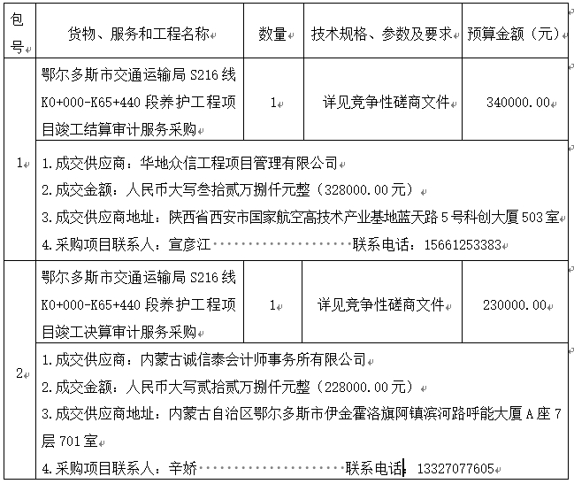 1.采购项目名称:鄂尔多斯市交通运输局S216线K0+000-K65+440段养护工程项目竣工结算审计、竣工决算审计服务采购