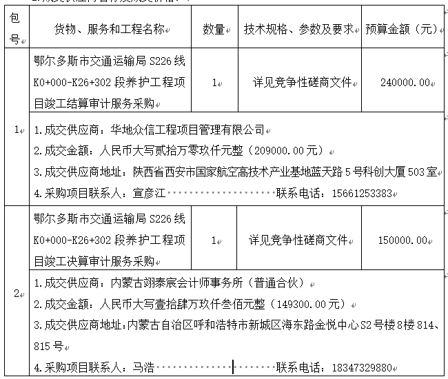 1.采购项目名称:鄂尔多斯市交通运输局S226线K0+000-K26+302段养护工程项目竣工结算审计、竣工决算审计服务采购
