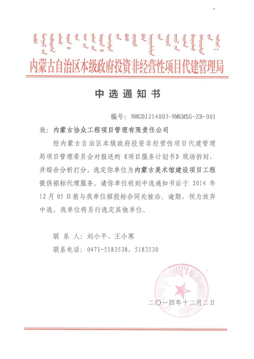 我公司中选自治区美术馆建设项目招标代理服务